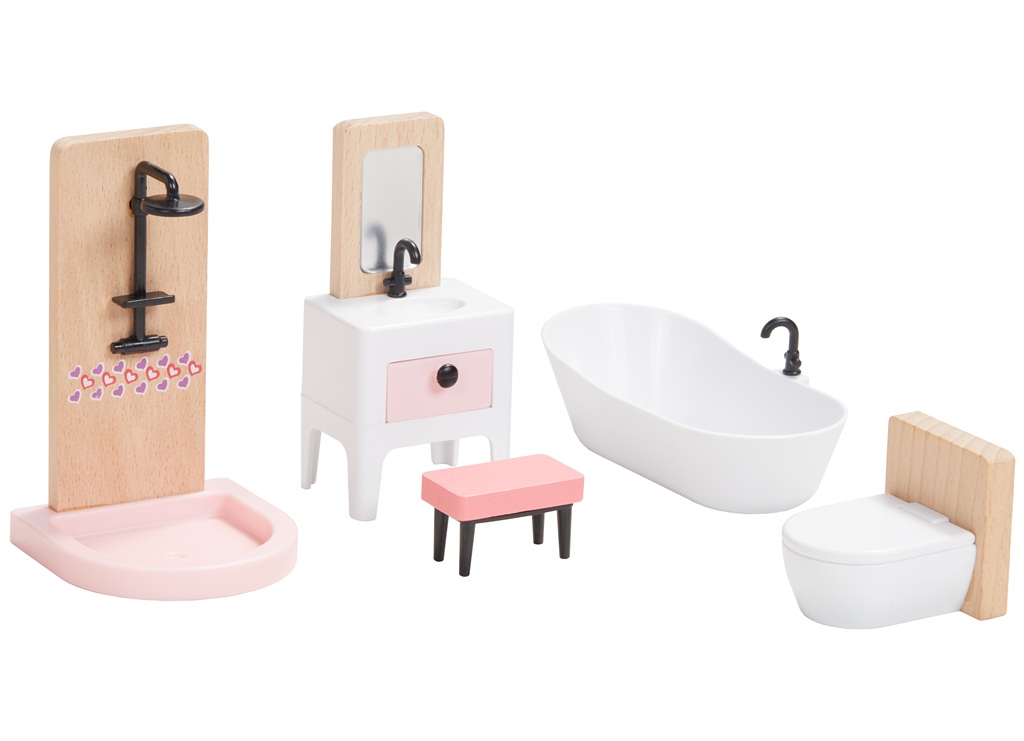 Skvělá sada dřevěného nábytku, díky které si můžete vybavit jakýkoli domeček. 5 v 1, to je ložnice, kuchyně, obývací pokoj, dětský pokoj,koupelna a k tomu i celá rodinka. Nádherně detailní dřevěné kousky pomohou mladým představám znovu a znovu vytvářet okouzlující interiérové ​​scény. Skládá se z 36 kusů. Žádný domeček pro panenky není kompletní bez této sady! Hlavní vlastnosti: obsahuje 36 ksvhodné jako kompletní sada do prvního domečku našich malých princezen trénuje komunikační dovednosti a koordinaciinspiruje ke kreativní a představivé hře