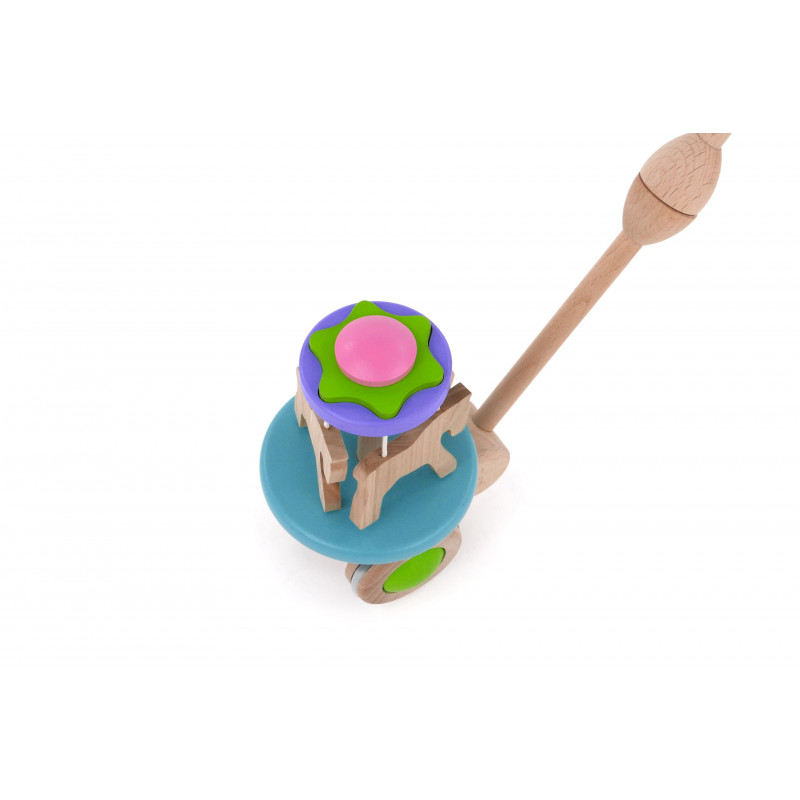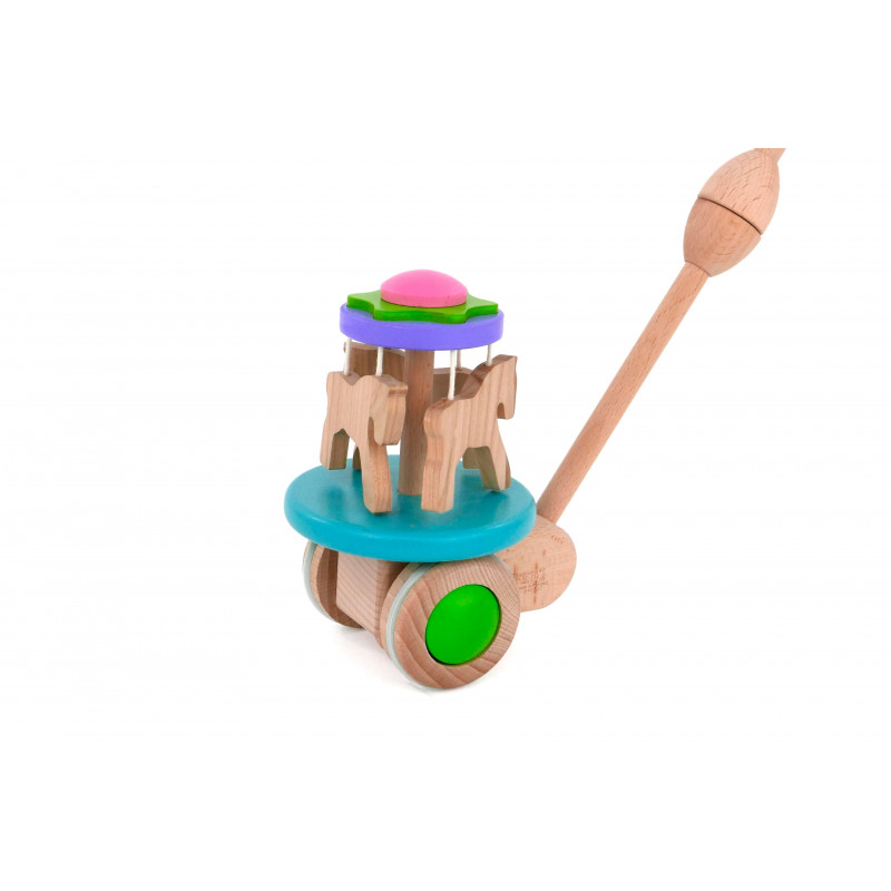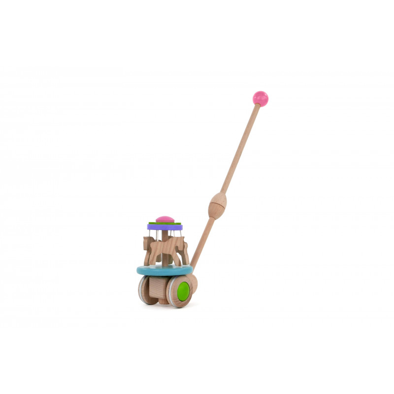Kdo jde do zábavního parku?Koně už se točí na kolotoči. Ale jak? koně? Takový kolotoč nikde není. Zvířata se na něm točí tak rychle, že se začnou vznášet. Je to všechno kvůli odstředivým silám. Když dítě s jezdíkem chodí, koně rotují, a když dítě zrychlí, zvednou se. Při hraní s touto hračkou zažívá mnoho “problémů”, díky kterým může poznávat svět. Jedním z nich je fyzikální zákon, založený na přenosu energie. Po uvedení do pohybu se aktivuje mechanismus, který způsobí, že se kolotoč otáčí kolem své osy, což se promítá do odstředivých sil působících na koníky. Hračka začíná měnit svůj původní vzhled, což dítě zaujme a vybízí ke hře. Rozvíjí také hrubou motoriku zapojením pohybů těla a rukou. Navíc podporuje první kroky. Pogumovaná kolečka zajišťují tichý chod na pevných podlahách Tato hračka a obal jsou vyrobeny z přírodních zdrojů a lze je snadno recyklovat. Doporučujeme povrch hračky čistit pouze vlhkým hadříkem. Nevystavujte, prosím, tuto hračku vysokým teplotám nebo vysoké vlhkosti, dřevo se za těchto podmínek může ohýbat a deformovat. Splňuje všechny evropské bezpečnostní normy. Hlavní vlastnosti: podporuje pohybovou aktiviturozvíjí rovnováhu zábavnou formoupogumovaná kolečka pro tichý chod na pevných podlahách