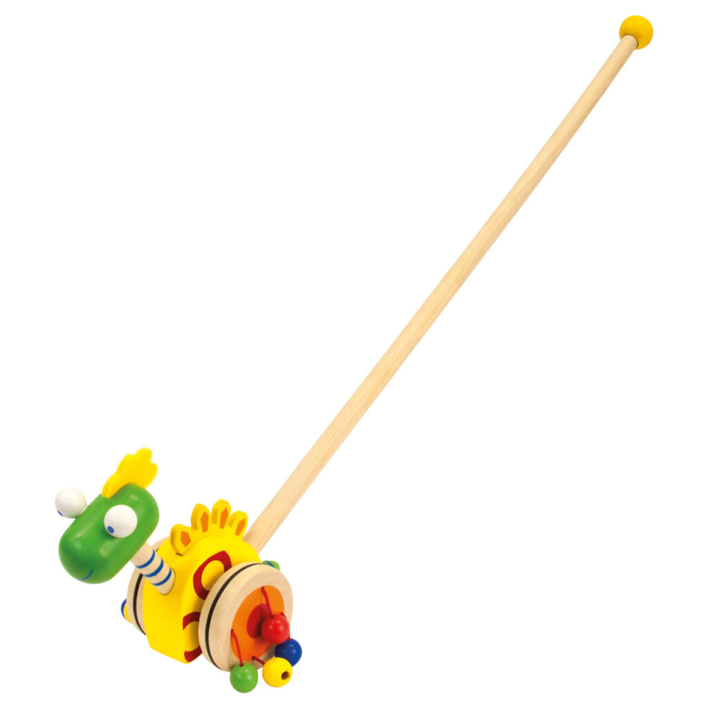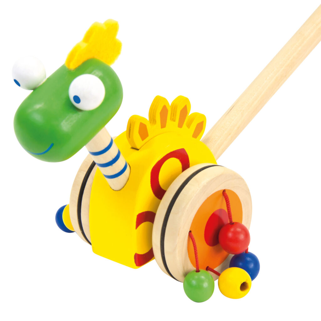 Poškozený obal. Nové zboží bez závad. Dřevěný dinosaurus na tyči s barevnými korálky na kolečkách, při jízdě vydává zvuky. Hlavní vlastnosti: podporuje dítě v prvních krůčcíchrozvíjí rovnováhu zábavnou formoukolečka vydávají veselý klapavý zvuk při otáčení