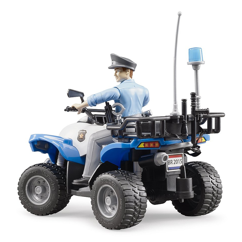 Terenní čtyřkolka s figurkou řidiče, policisty. Řízení modelu je možné pomocí řidítek. Možnost natáčení přední nápravy. Nápravy čtyřkolky jsou odpružené. Je také možné vložení další figurky BRUDER WORLD do sedadla. Čtyřkolka je mechanicky pohyblivá. Hrací plastová figurka má policejní uniformu a součástí jsou také pomůcky používané při práci – Policejní čepice, opasek, pouta, vysílačka, pistole, baterka a obušek. Pomůcky lze k figurce libovolně připevňovat a figurku lze použít i k autům a modelům BRUDER. Vyrobeno v Německu, z kvalitních materiálů. Hlavní vlastnosti: policejní čtyřkolka s natáčecí přední nápravoukompatibilní s figurkami BWORLDpolicista v uniformě s příslušenstvímvyrobeno v Německu