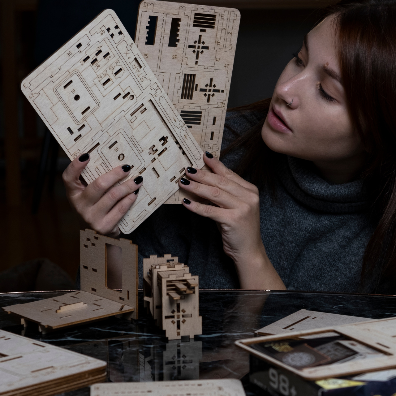 V roce 3143 vědci objevili další obyvatelnou planetu, X63Z. Na utajenou misi sbírat na planetě vzorky k dalšímu výzkumu byl vyslán zkušený astronaut Bubu. Na Zemi je již očekáván jeho návrat z náročné mise, když v tom je náhle zaznamenáno nouzové volání. Palivové články vesmírné lodi poškodil asteroid a hrozí jejich výbuch, posádka i cenný náklad jsou v bezprostředním ohrožení!Zapojte logické myšlení a pokuste se vysvobodit z vesmírného plavidla astronauta i nasbírané vzorky. Nejmodernější technologie zabezpečení lodi z celého úkolu dělají nelehkou misi. Podaří se Vám je včas zachránit?∗★∗Nepovažujete hotový hlavolam za dostatečnou výzvu a chcete jej napřed sami sestavit? S novou řadou mechanických puzzle EscapeWelt máte jedinečnou příležitost! Stavebnicí z překližky vyzkoušíte svůj důvtip a dovednosti hned dvakrát. Výsledný model ukrývá malou přihrádku, kterou můžete kreativně využít k úschově vodítka ve vlastní dobrodružné hře, nebo zpestření zážitku z drobného dárku. Součástí balení je podrobný obrázkový návod k sestavení a postup odemknutí, který obsahuje také QR kód vedoucí na stránku s nápovědou. Rébus má vždy jedno řešení, kvalitním provedením je ale předurčen k dalšímu použití, neváhejte jím proto dále obdarovat a vyzvat své přátele, nebo členy rodiny. Hlavní vlastnosti: 98 precizně vyřezaných dílkůrozměry vnitřní přihrádky 5×5×6 cmvysoká obtížnost sestavení a řešeníúniková hra pro více hráčůnení potřeba lepidlopřírodní březové dřevovyrobeno v EU