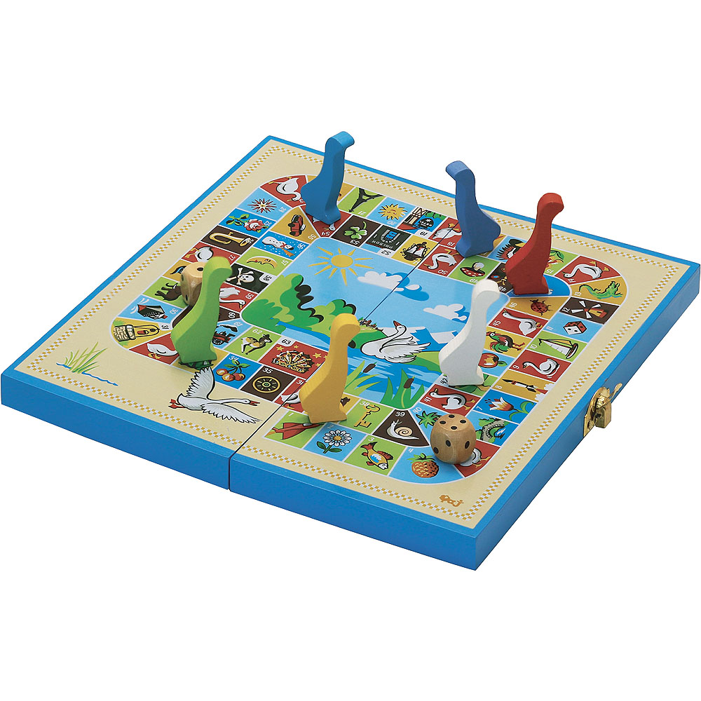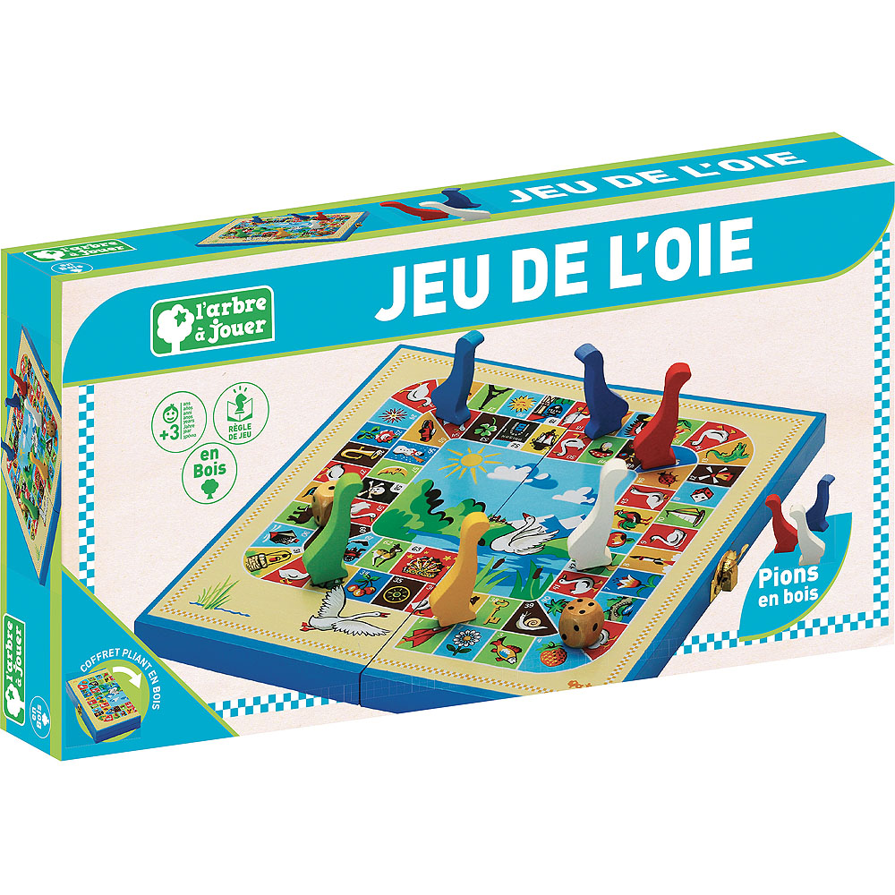 Klasická francouzská desková hra pro 2–6 hráčů v tradičním cestovním provedení, vyrobená z masivního dřeva. Hlavní vlastnosti:pro 2–6 hráčůvšechny součásti z masivního dřevapraktické balení Pravidla hry: Cílem hry je vstoupit na vítězné políčko č. 63. Před začátkem hry si každý hráč zvolí svou figurku husy. Poté každý z nich hodí oběma kostkami zároveň. Hráč, který hodil nejvyšší číslo, začíná. Figurky posouvejte o tolik bodů, kolik padlo při hodu kostkou. Jestliže skončíte na políčku s obrázkem husy, máte štěstí – posuňte svou figurku znovu o stejný počet polí. Když hodíte šestku a trojku při prvním tahu, posouváte se na pole č. 26.Pokud hodíte čtyřku a pětku, posouváte se na pole č. 53.Pokud šlápnete na pole č. 6, posouváte se na pole č. 12.„Ten, kdo jde lovit, ztrácí své místo…“ Na políčku č. 22 se musíte posunout o 3 pole zpět.Abyste se dostali ze studny na poli č. 30, musíte hodit šestku.Na poli č. 35 se dostanete do hotelu, jedno kolo stojíte.Bludiště na poli č. 42 vás pošle zpátky na pole č. 31.Ve vězení, na poli č. 52 stojíte dvě kola.Na poli č. 58 se ztratíte v žaláři a musíte se vrátit zpět na start.Pokud hodíte takové číslo, které by Vás dostalo za pole č. 63, musíte se o tolik polí posunout zpět po herní ploše.