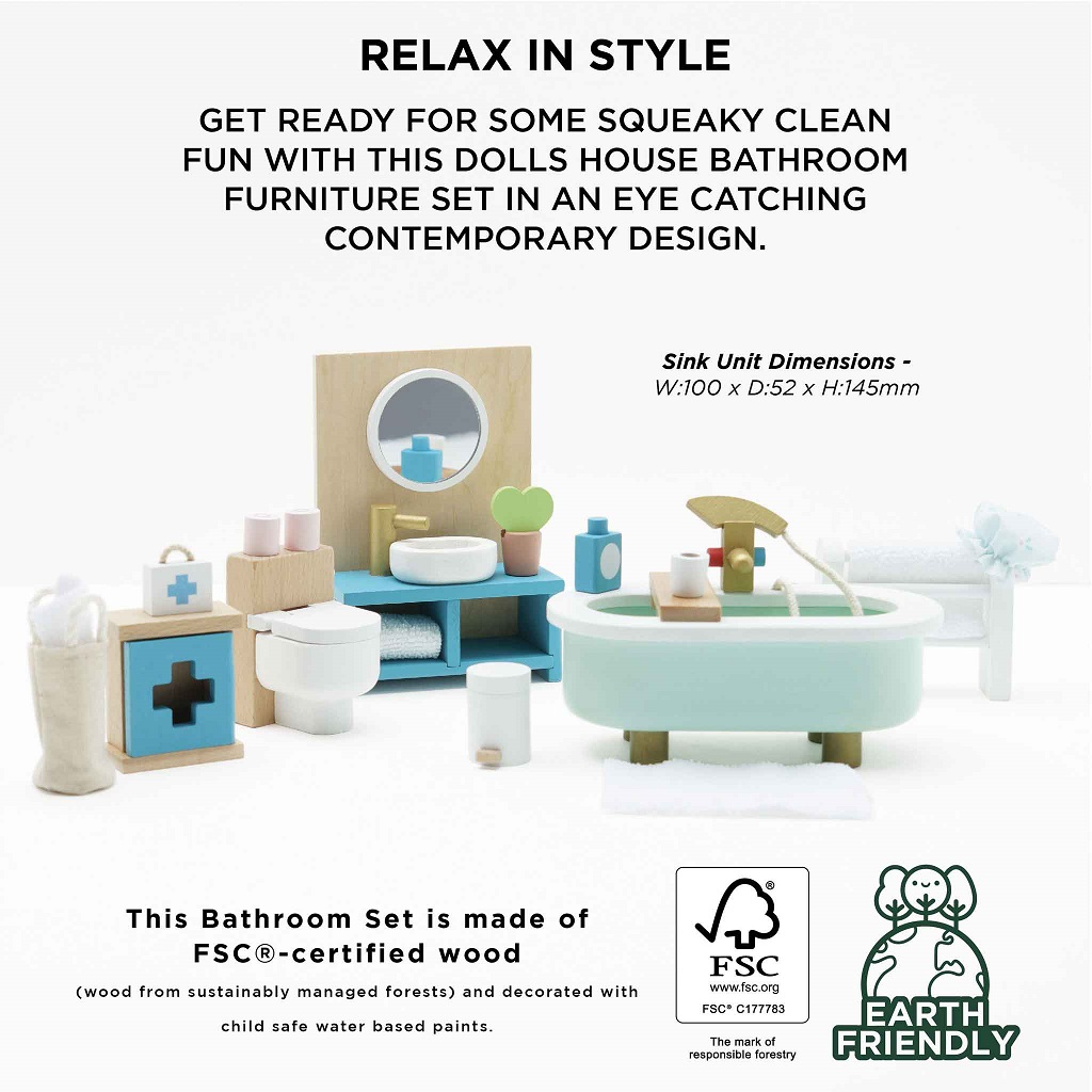 Tradiční a barevná sada nábytku a vybavení koupelny ze dřeva. Bude se perfektně hodit do dětských domečků pro panenky. Šest kusů nábytku a doplňky – vana, toaleta, umyvadlo, věšák na ručníky, lékárnička. Sada nábytku v retro stylu je vyrobena eticky za použití udržitelných materiálů. Velikostně se hodí do domečků pro panenky od Le Toy Van, více doplňků domečků z řady Daisylane najdete na našem webu. Hračky s účelemVšechny hračky firmy Le Toy Van jsou vyrobeny s cílem – aby dlouho vydržely. Designovány s láskou zkušenými řemeslníky za použití etických praktik a udržitelných materiálů, které jsou laskavější k naší planetě. Hlavní vlastnosti: měřítko 1:12vyrobeno eticky z udržitelných materiálůtestováno dle nejpřísnějších standardůmalováno netoxickými barvami na bázi vodytrénuje komunikační dovednosti a koordinaciinspiruje ke kreativní a představivé hře Daisylane kolekce: Prestižní kolekce domečků pro panenky a doplňků firmy Le Toy Van. Před více než 25 lety zakladatel Georges navrhl svůj úplně první domeček pro panenky, stavební kámen této firmy. Vyrobeno eticky z udržitelných materiálů, dřevěné domečky pro panenky Daisylane jsou jedinečné a nebudou dětskou představivost držet zpátky. Rodinné dědictví, opravdová investice do hraní.