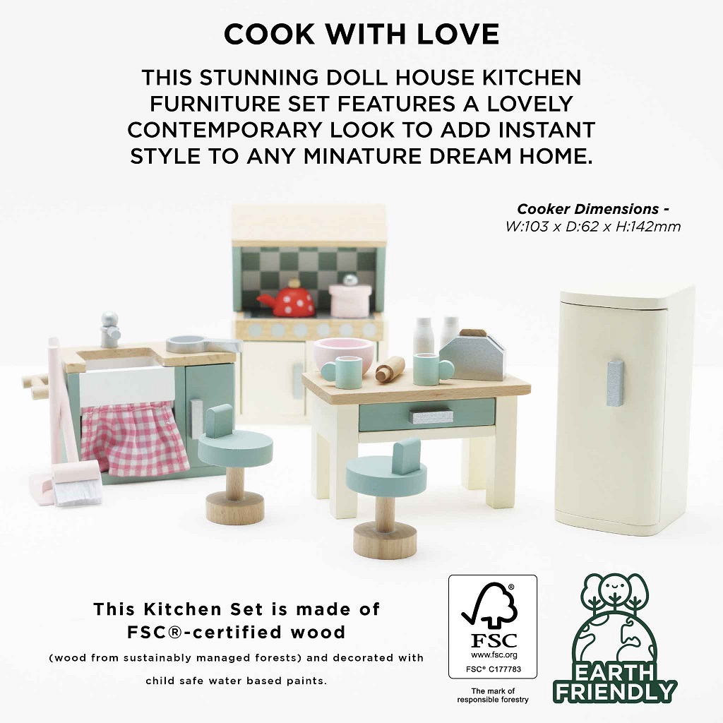 Žádný domeček pro panenky není kompletní bez vybavené kuchyně. S tímto krásným dřevěným setem do kuchyně mohou děti uvařit nebo upéct něco dobrého pro své miniaturní hosty. Tento představivý set s důrazem na detail se skládá z dřezu, sporáku, trouby s otevíratelnými dveřmi, velké lednice s otevíratelnými dveřmi, stolu s 2 židličkami, na kterém můžete krájet a připravovat. Velikostně se hodí do domečků pro panenky od Le Toy Van, více doplňků domečků z řady Daisylane najdete na našem webu. Hračky s účelemVšechny hračky firmy Le Toy Van jsou vyrobeny s cílem – aby dlouho vydržely. Designovány s láskou zkušenými řemeslníky za použití etických praktik a udržitelných materiálů, které jsou laskavější k naší planetě. Hlavní vlastnosti: měřítko 1:12vyrobeno eticky z udržitelných materiálůtestováno dle nejpřísnějších standardůmalováno netoxickými barvami na bázi vodytrénuje komunikační dovednosti a koordinaciinspiruje ke kreativní a představivé hře  Daisylane kolekce: Prestižní kolekce domečků pro panenky a doplňků firmy Le Toy Van. Před více než 25 lety zakladatel Georges navrhl svůj úplně první domeček pro panenky, stavební kámen této firmy. Vyrobeno eticky z udržitelných materiálů, dřevěné domečky pro panenky Daisylane jsou jedinečné a nebudou dětskou představivost držet zpátky. Rodinné dědictví, opravdová investice do hraní.    Značka a certifikát FSC® (Forest Stewardship Council) zaručuje, že dřevo, ze kterého byl produkt vyroben, nebylo vytěženo nelegálně a pochází z lesů obhospodařovaných šetrným či přírodě blízkým způsobem, ve kterém jsou dodržovány přísné environmentální a sociální požadavky. Značka FSC® na výrobku znamená, že svým nákupem pomáháte chránit lesy a podporujete šetrné, odpovědné či přírodě blízké hospodaření, díky kterému jsou naše lesy stabilnější, zdravější, mají přirozenou druhovou skladbu a lépe odolávají negativním následkům klimatických změn.