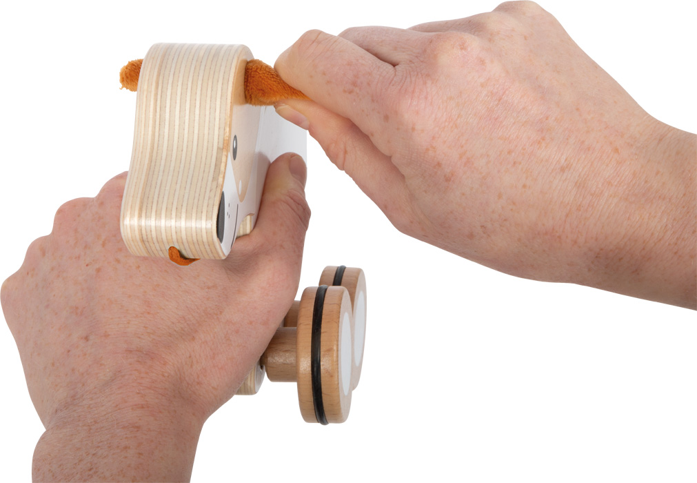 Haf, haf! Nejlepší přítel člověka roztomilý pejsek s měkkýma ušima a ocáskem vyrobený z vysoce kvalitního pevného dřeva se jistě stane nezapomenutelným kamarádem každého dítka při jeho prvních samostatných krůčcích. Dá se snadno táhnout na provázku a povzbuzuje malé děti k lezení a chůzi. Užijí si tak při procházkách spoustu zábavy. Přední část těla pejska a hlava jsou pohyblivé, takže může panáčkovat a když se povolí provázek, vypadá to, že pejsek očichává podlahu. Pogumovaná kolečka napomáhají plynulé a tiché jízdě. Hračka podporuje rozvoj motorických dovedností, pohyblivosti a smyslového vnímání. Uši a ocásek lze snadno odebrat a vyprat. Hlavní vlastnosti: robustní provedenípohyblivé tělo a hlavaodnímatelné měkké uši a ocásekse šňůrou dlouhou 60 cmpodporuje rovnováhu a koordinaci pohybůrozvíjí motorické dovednostis tichými pogumovanými kolečkyinspiruje dětskou kreativitu a představivost