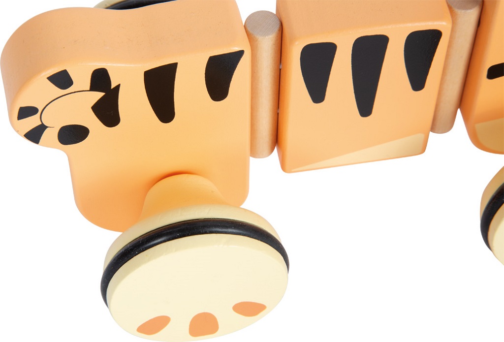 Roztomilý tahací tygřík potěší všechny malé objevitele. Vyrobený ze 100% certifikovaného dřeva FSC®, je nejen ekologický, ale i mimořádně odolný. Díky pogumovaným, tichým kolečkům se hladce pohybuje po podlaze, zatímco flexibilní třídílné tělo se při tažení krásně vlní. Součástí je i tahací provázek, který dětem usnadňuje vedení tygříka a zároveň podporuje jejich samostatnost při chůzi. Jeho přátelský design v safari stylu si děti okamžitě zamilují. Tento veselý společník podporuje rozvoj motoriky, rovnováhy i první krůčky těch nejmenších.Kvalitní zpracování a detailní ilustrace dělají z tygříka oblíbenou hračku, která se skvěle doplňuje s dalšími hračkami z kolekce Safari.  Hlavní vlastnosti: robustní provedenípodporuje rovnováhu a koordinaci pohybůrozvíjí motorické dovednostis tichými pogumovanými kolečkyinspiruje dětskou kreativitu a představivost   Značka a certifikát FSC® (Forest Stewardship Council) zaručuje, že dřevo, ze kterého byl produkt vyroben, nebylo vytěženo nelegálně a pochází z lesů obhospodařovaných šetrným či přírodě blízkým způsobem, ve kterém jsou dodržovány přísné environmentální a sociální požadavky. Značka FSC® na výrobku znamená, že svým nákupem pomáháte chránit lesy a podporujete šetrné, odpovědné či přírodě blízké hospodaření, díky kterému jsou naše lesy stabilnější, zdravější, mají přirozenou druhovou skladbu a lépe odolávají negativním následkům klimatických změn.