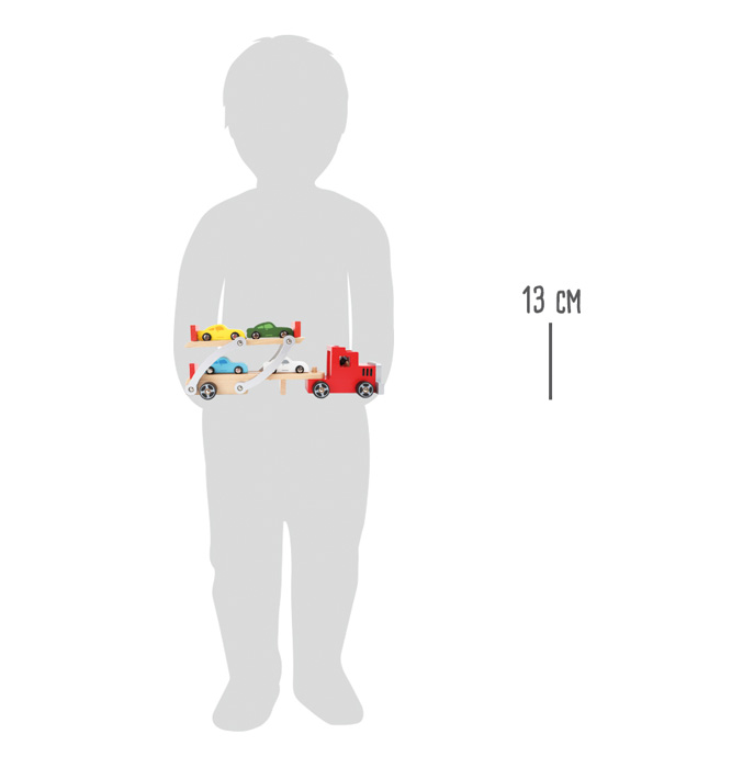Poškozený obal. Nové zboží bez závad. Pozor, zde se nakládají břemena! Chcete-li převézt nové modely aut z místa A na místo B, budete určitě potřebovat tento auto-přepravník. Naložit lze čtyři auta. Dřevěná auta mohou pohodlně vyjet na nákladní rampu. Zvednutá plocha opatřena závorou zabrání nechtěnému couvnutí aut. Včetně čtyř dřevěných aut v designu sportovních vozů. Přívěs se připojí k tahači a vše je připraveno na dlouhou a bezpečnou cestu. Ideální pro fanoušky aut a skvělý doplněk do vozového parku autíček v dětském pokoji. Hlavní vlastnosti: vyrobeno z robustního dřeva v pestrobarevném provedení pohyblivá horní plošina pro snadné nakládání a vykládání včetně čtyř autíček