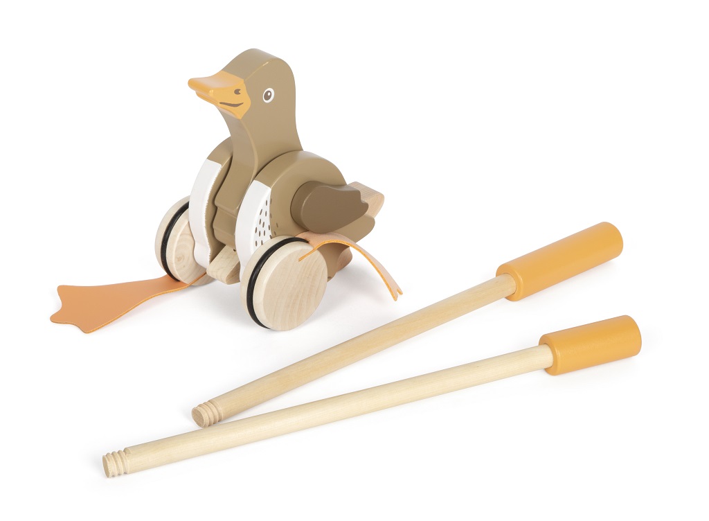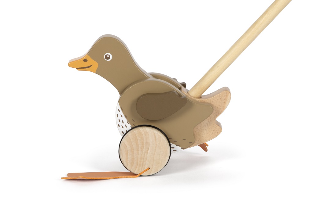 Představujeme Vám dřevěnou tahací kačenku na tyči – malého pomocníka pro první krůčky Vašeho dítěte! Tato robustní dřevěná hračka s kolébavýma nožičkama je navržena tak, aby rozzářila oči Vašeho malého průzkumníka a vzbudila v něm touhu objevovat svět kolem sebe. Veselé klapavé zvuky a kolébání hlavy jezdíka přinese radost z pohybu a hry. Dřevěná tyč, která je výškově nastavitelná, poskytuje oporu při prvních nejistých krůčcích. Rovnováha a pohyb jsou dovednosti, které dětem tento jezdík pomůže rozvinout. Děti mohou kačenku strkat nebo tahat doma i venku. Sledujte, jak se Vaše dítě učí a směje s každým krokem, který udělá s tímto dřevěným kamarádem. Hlavní vlastnosti: zábavnou formou podporuje pohybovou aktivitu dětírozvíjí motorický vývoj a koordinaci pohybuvýškově nastavitelná tyč jezdíkavhodné od 1,5 rokupři zatlačení jezdík pohybuje hlavoupogumovaná a tichá kolečkacertifikát FSC Značka a certifikát FSC® (Forest Stewardship Council) zaručuje, že dřevo, ze kterého byl produkt vyroben, nebylo vytěženo nelegálně a pochází z lesů obhospodařovaných šetrným či přírodě blízkým způsobem, ve kterém jsou dodržovány přísné environmentální a sociální požadavky. Značka FSC® na výrobku znamená, že svým nákupem pomáháte chránit lesy a podporujete šetrné, odpovědné či přírodě blízké hospodaření, díky kterému jsou naše lesy stabilnější, zdravější, mají přirozenou druhovou skladbu a lépe odolávají negativním následkům klimatických změn.