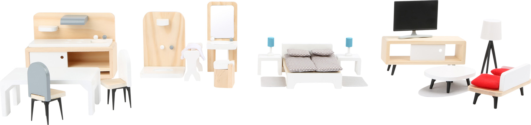 Moderní nábytek do domečku pro panenky ve skandinávském stylu. Komplet se skládá z obývacího pokoje, kuchyně, ložnice a koupelny. Nábytek je detailně zpracován. Například toaletu lze otevírat a zavírat, dvířka skříně a kuchyňské linky jsou posuvné. Součástí jsou i koberce, zrcadlo či ložní prádlo.  Hlavní vlastnosti: obsahuje 28 dílůkvalitní detailní zpracování moderní provedenívhodné pro panenky do 12 cmpodporuje hraní rolí a představivost