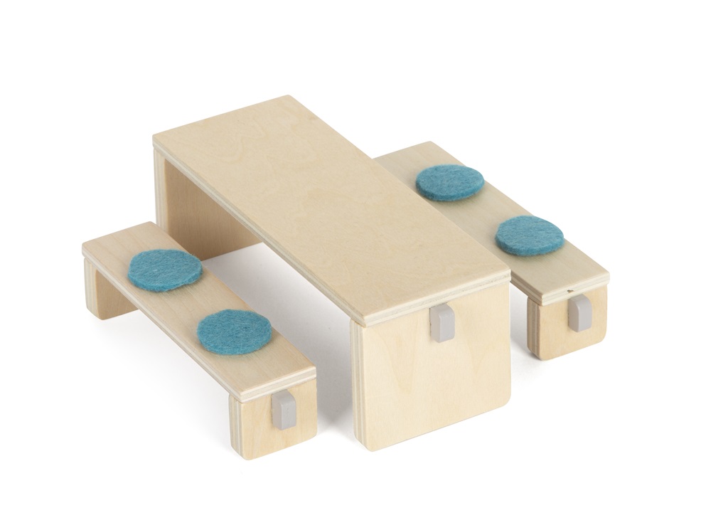 Tato detailně propracovaná kuchyň bude krásným doplňkem každého domečku pro panenky. Skládá se z vysoké kuchyňské skříně, samostatně stojícího kuchyňského ostrůvku, 2 taburetů a stolu se 2 lavicemi se sedáky, které se dají sundat. Součástí kuchyňské skříně je kombinovaná lednice s mrazničkou a trouba s otevíracími dvířky. Kuchyňský ostrůvek má varnou desku a dřez a také dvě vyjímatelné zásuvky. Jako místo k posezení u ostrůvku slouží dva taburety. Děti si mohou nakreslit obsah kuchyňské linky – např. potraviny a vybavení na kartón (3 ks kartónu jsou součástí balení) a ten použít jako zadní stěnu linky. Hlavní vlastnosti: možnost nakreslit si vlastní obsah kuchyňské linkydetailní zpracovánírozvíjí fantazii a kreativní hru