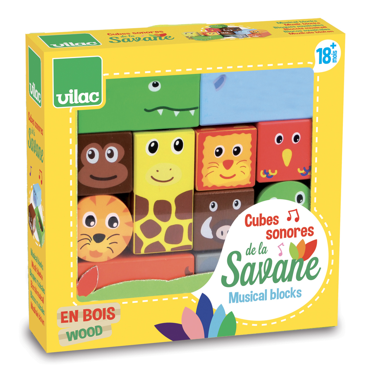 Jedenáct dřevěných zvukových kostek s motivem savany. S těmito kostkami si děti procvičí motoriku i zručnost a zároveň budou objevovat zvuky. Pro děti velmi poutavá hračka. Hlavní vlastnosti: edukativní senzorické kostky obsahuje 11 kostek