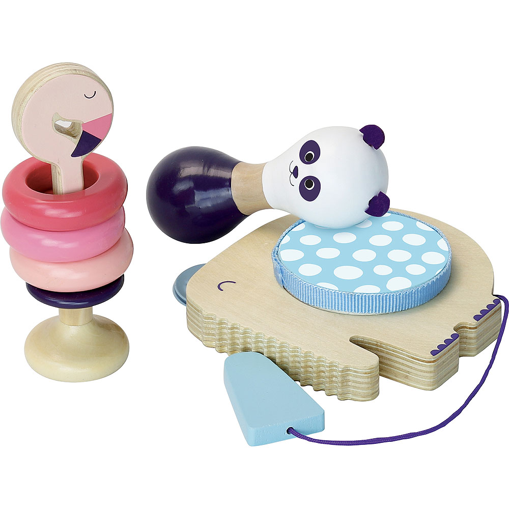 Krásná hudební sada pro nejmenší. Skládá se z barevné rumba koule pandy, sloní tamburíny a chrastítka plameňáka. Vhodné od 12 měsíců. Hlavní vlastnosti: podporuje lásku k hudbě a rytmikuobsahuje 3 díly